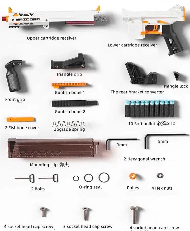 Rich Accessories: Comes with a variety of accessories for a customized experience, including a split receiver, extendable stock, talon mag compatibility, and more.