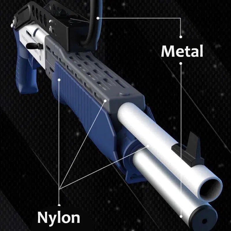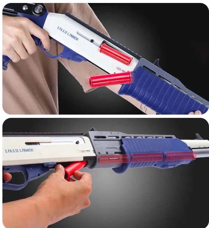 This UDL Spas-12 faom blaster gun is made of metal and nylon, the manual pump action simulating the shell ejection process of a real spas12.